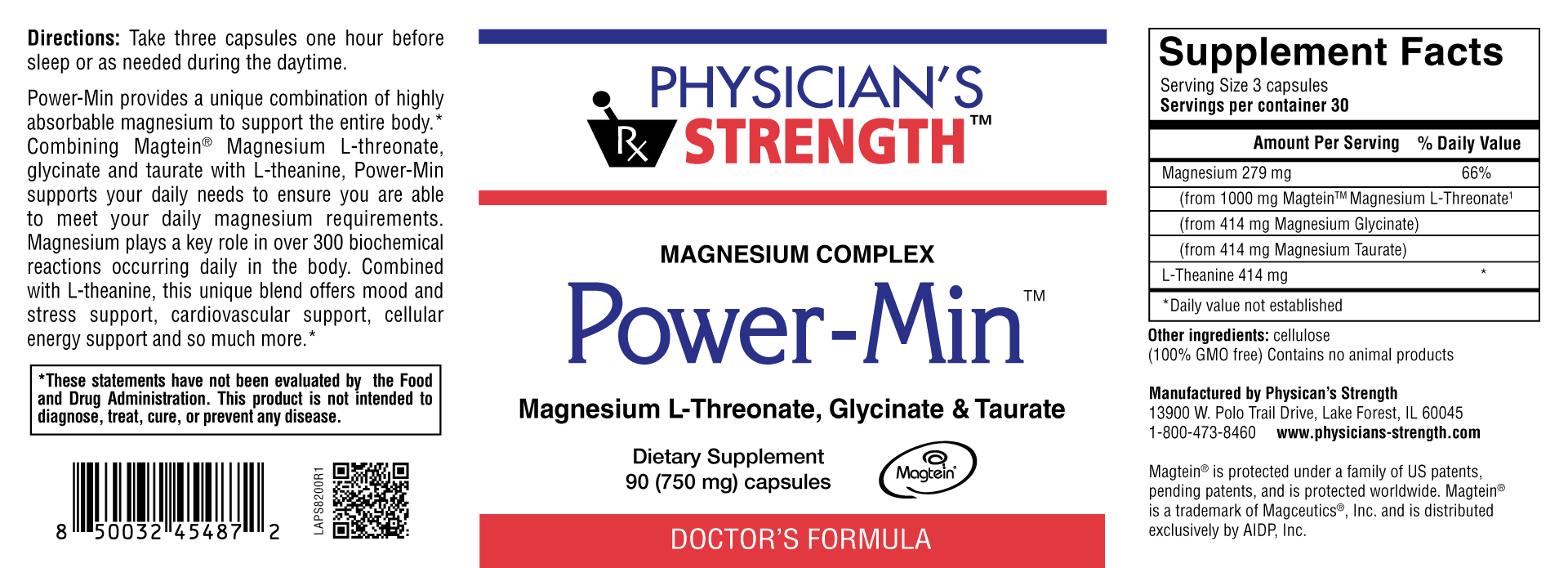 Power-Min provides a unique combination of highly absorbable magnesium to support the entire body.* Combining Magtein® Magnesium L-threonate, glycinate and taurate with L-theanine, Power-Min supports your daily needs to ensure you are able to meet your daily magnesium requirements. Magnesium plays a key role in over 300 biochemical reactions occurring daily in the body. Combined with L-theanine, this unique blend offers mood and stress support, cardiovascular support, cellular energy support and so much more.*